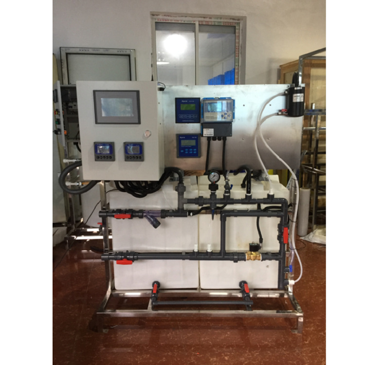 示蹤劑加藥裝置由示蹤劑儀表、PH儀表、0RP儀表、電導率儀表、控制系統(tǒng)、無線遠傳系統(tǒng)等部分組成。其工作原理是由示蹤劑儀表檢測循環(huán)水系統(tǒng)中藥劑的濃度,進行PID運算,然后自控制系統(tǒng)啟動或關閉加藥泵往循環(huán)水系統(tǒng)添加藥劑。其功能是使藥劑穩(wěn)定在一定的濃度范圍,達到保護管道不會結垢或腐蝕的趨勢。循環(huán)水系統(tǒng)進行排污或補水時,只要藥劑濃度滿足設定值,加藥泵依然不向系統(tǒng)中投加藥劑。從而節(jié)約客戶使用藥劑的成本。