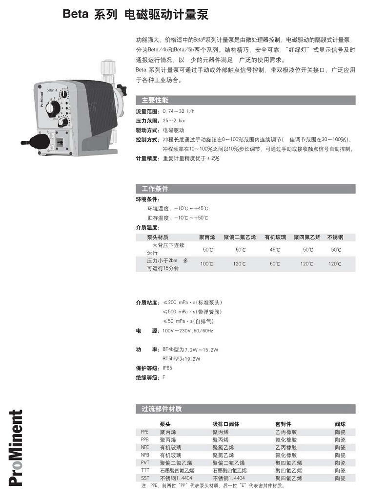 Beta電磁計量泵能夠滿足現代水處理和化學品計量中所有調節和控制功能的要求。相比以前,其特點為脈沖步進降低和增加的功能。這樣更容易接受外部信號傳感器的調節。針對實際要求更簡單的調節計量。由于新技術的應用,能量消耗可以降低大約50%。在操作過程中Beta計量泵可以很方便的再次調節。