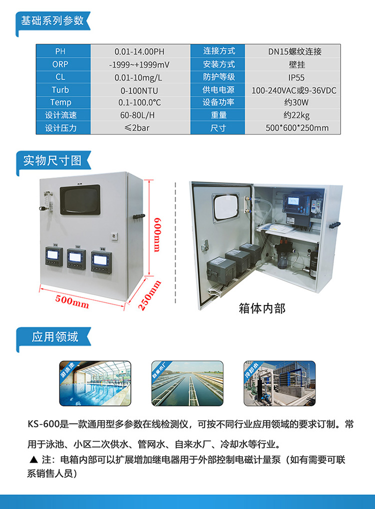 KS-600是一款通用型多參數在線檢測儀,可按不同行業應用領域的要求訂制。常用于泳池、小區二次供水、管網水、自來水廠、冷卻水等行業。