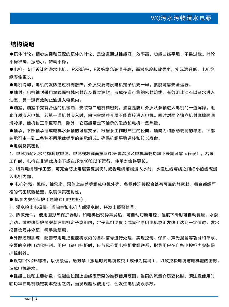 產(chǎn)品說明:南方WQ污水污物潛水電泵由電機(jī)與泵兩部分組成,兩者通過油室及機(jī)械密封組件隔開,分固定式自動耦合安裝和移動安裝。