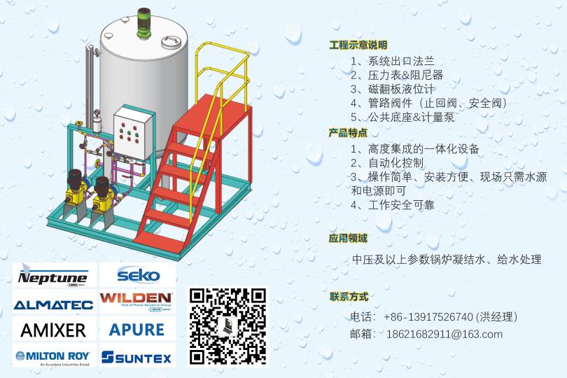 循環水加藥裝置,示蹤劑加藥裝置,遠程控制DCS加藥裝置,PAC加藥裝置,PAM加藥裝置,酸堿中和加藥裝置,冷卻塔加藥裝置,干粉投加裝置,高分子自動泡藥機,PAM自動制備系統,絮凝劑制備系統,PAC自動溶解混合配制裝置,純水反滲透裝置,軟化水系統,過濾系統,遠程控制系統,安全閥,背壓閥,流量校正柱,管道式流量計等。
